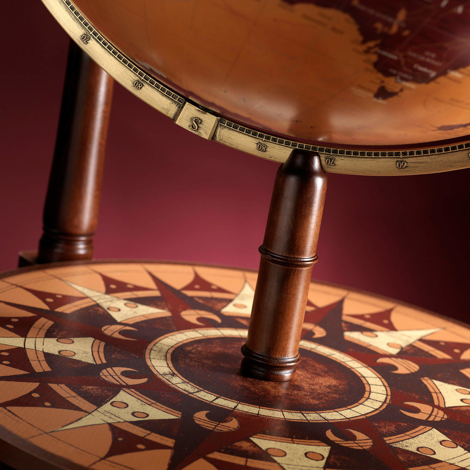 Met een totale hoogte van 90 cm is de Aries een echte blikvanger in elk interieur — van klassiek tot modern. De bol is volledig draaibaar en rust op stevige wielen, zodat hij eenvoudig te verplaatsen is. In tegenstelling tot de meeste Zoffoli-modellen bevat de Aries geen drankencabinet, waardoor de nadruk volledig ligt op het esthetische design en de verfijnde cartografische details. Een perfecte keuze voor wie zoekt naar decoratieve klasse en ambachtelijke schoonheid.