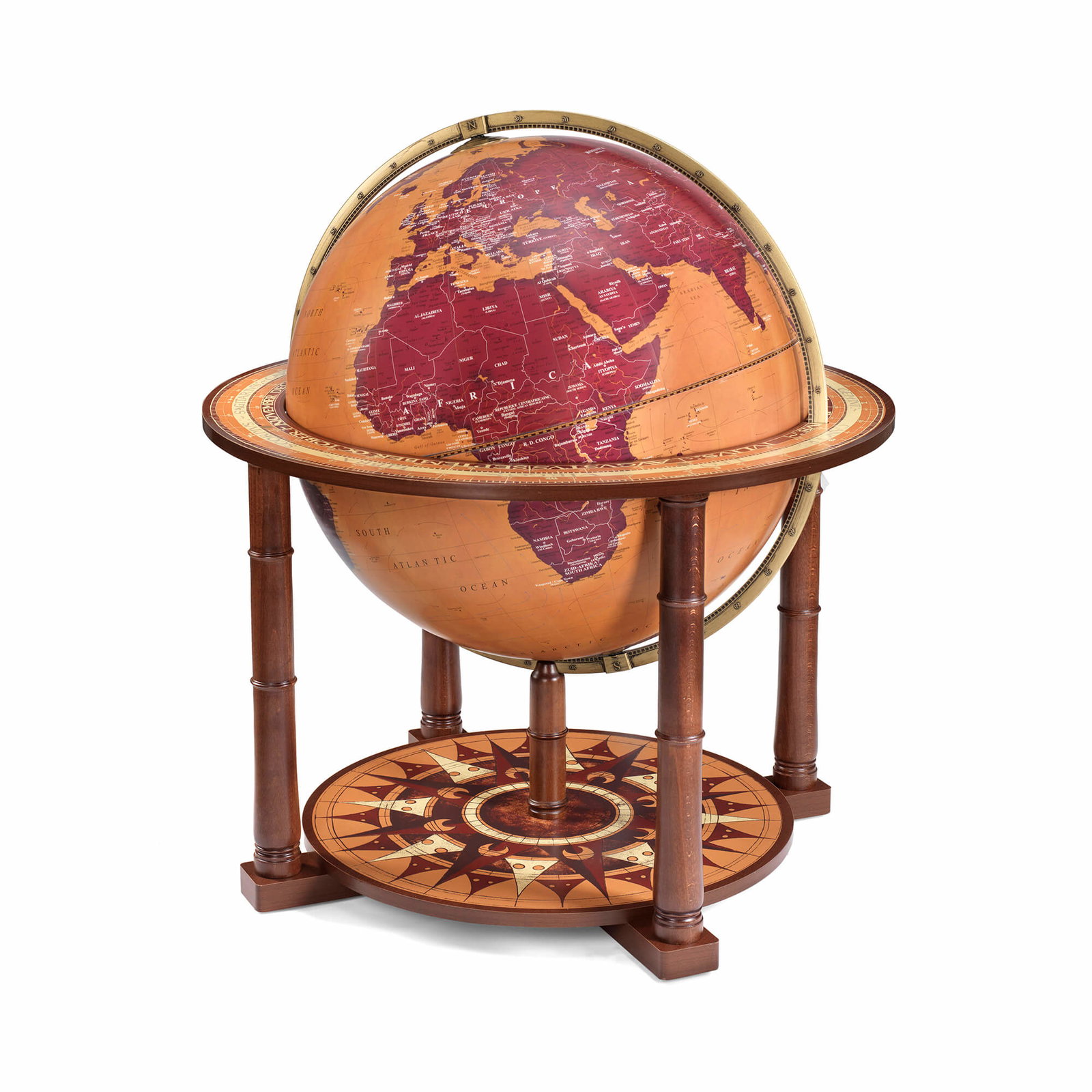 De Zoffoli Aries is een indrukwekkende designglobe waarin hedendaagse elegantie en traditioneel Italiaans vakmanschap samenkomen. De royale bol van 60 cm is vervaardigd uit cellulose en polymeer en toont een modern kaartbeeld in warme oker- en bordeauxrode tinten. Deze stijlvolle kleurencombinatie geeft de globe een luxueuze en artistieke uitstraling. De handgeschilderde MDF-afwerking en de voet van massief hardhout getuigen van de zorg en precisie waarmee Zoffoli zijn meesterwerken vervaardigt.