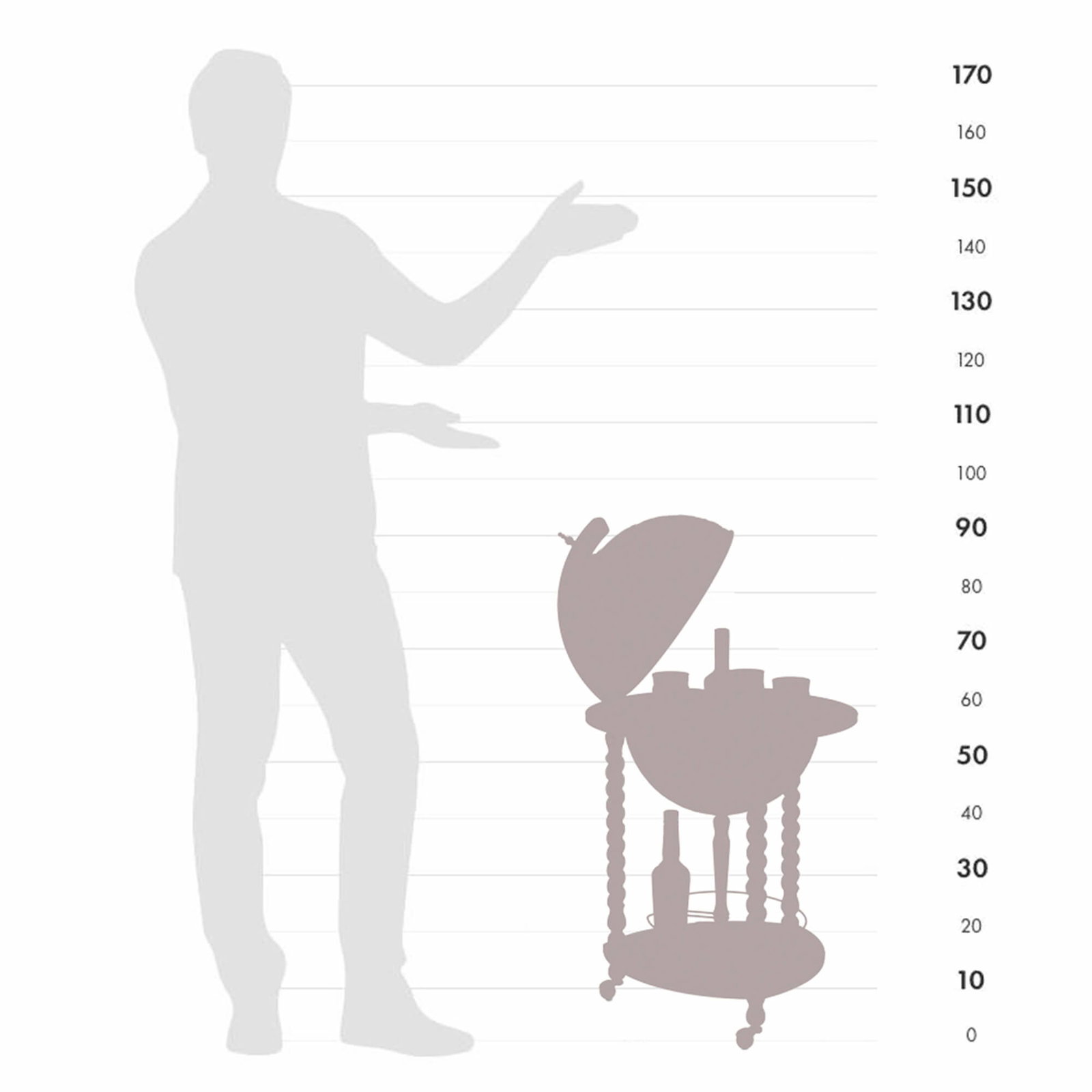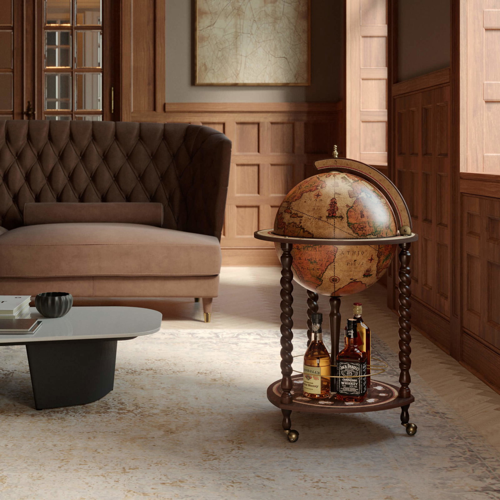 Met een diameter van 40 cm en een totale hoogte van 93 cm is de globe een stijlvolle blikvanger in elk interieur. De bol is volledig draaibaar en rust op stevige wielen, waardoor hij eenvoudig te verplaatsen is. Binnenin bevindt zich een verborgen compartiment met ruimte voor flessen en glazen — ideaal voor een sfeervol aperitiefmoment. De Explora Honey Brown is een perfecte balans tussen elegantie, traditie en functionaliteit.
