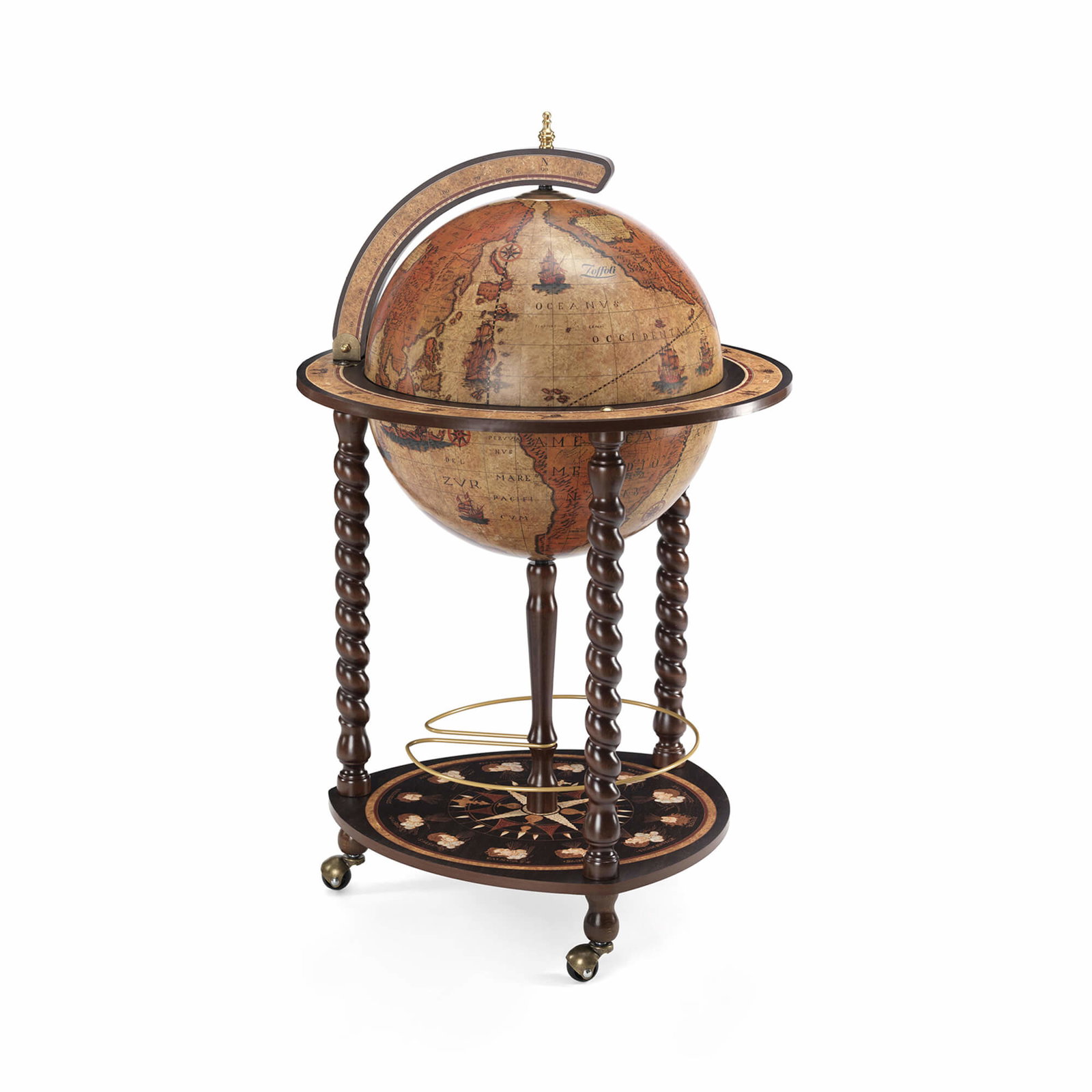De Zoffoli Explora Honey Brown is een handgemaakte bar globe die klassieke charme en praktisch design combineert. De bol, vervaardigd uit cellulose en polymeer, toont een authentiek 18e-eeuws kaartbeeld in warme honingbruine tinten. De met de hand afgewerkte houten structuur en MDF-details benadrukken het Italiaanse vakmanschap waar Zoffoli om bekendstaat.