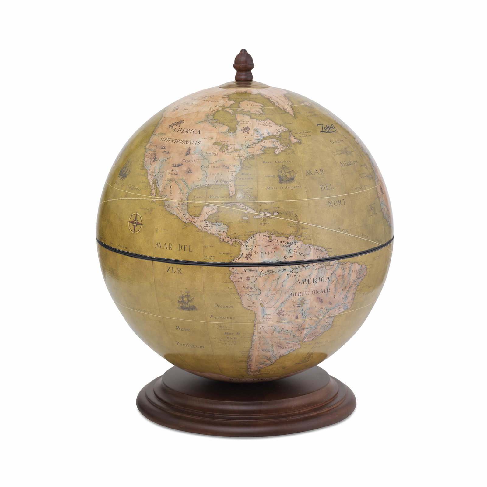 De Zoffoli Giove Olive Green straalt ingetogen elegantie en Italiaanse verfijning uit. De bol, vervaardigd uit cellulose en polymeer, toont een authentiek 18e-eeuws kaartbeeld in warme olijf- en aardetinten — een kleurenpalet dat rust en natuurlijke harmonie uitstraalt. De handgeschilderde MDF-afwerking en de voet van massief hardhout versterken het ambachtelijke karakter van deze met zorg gemaakte bar globe.